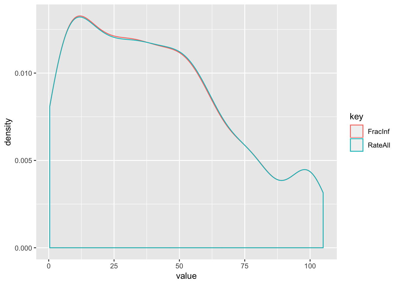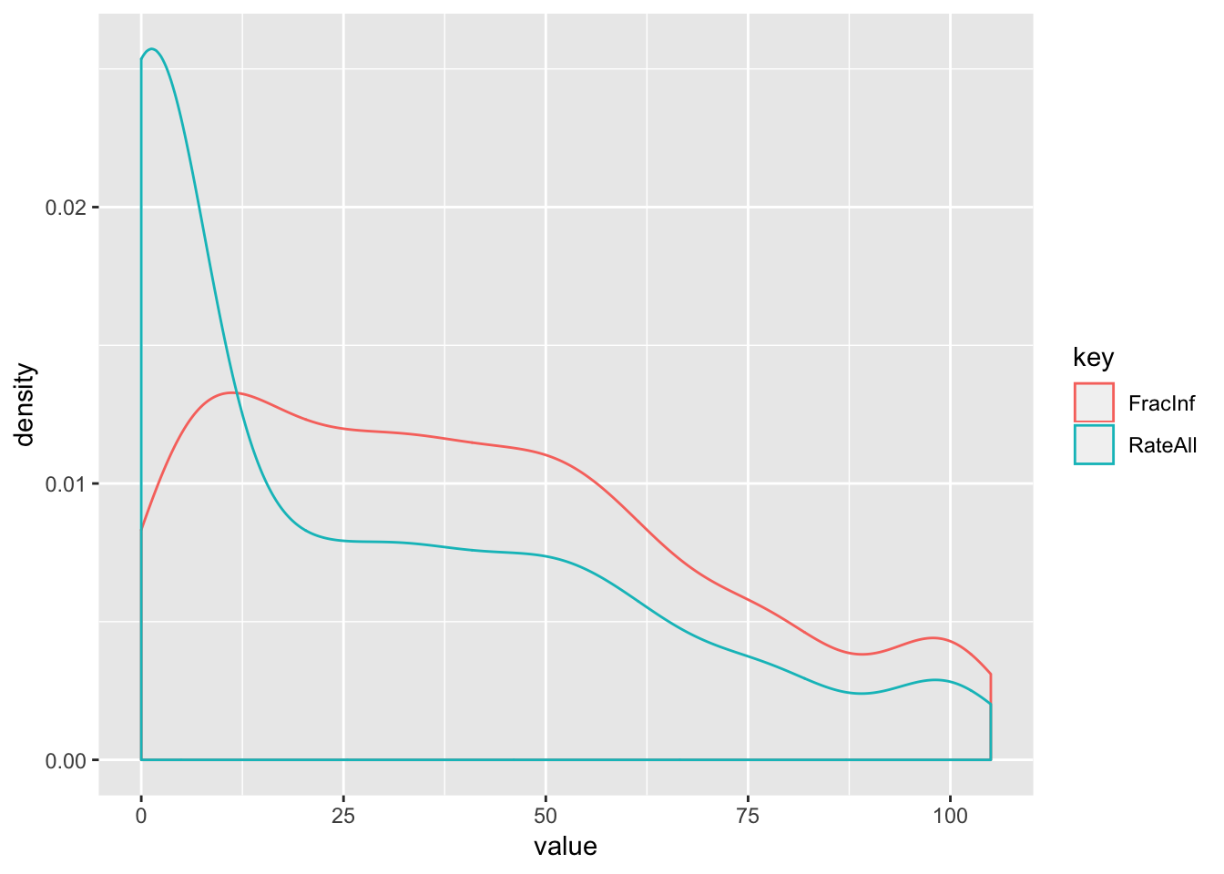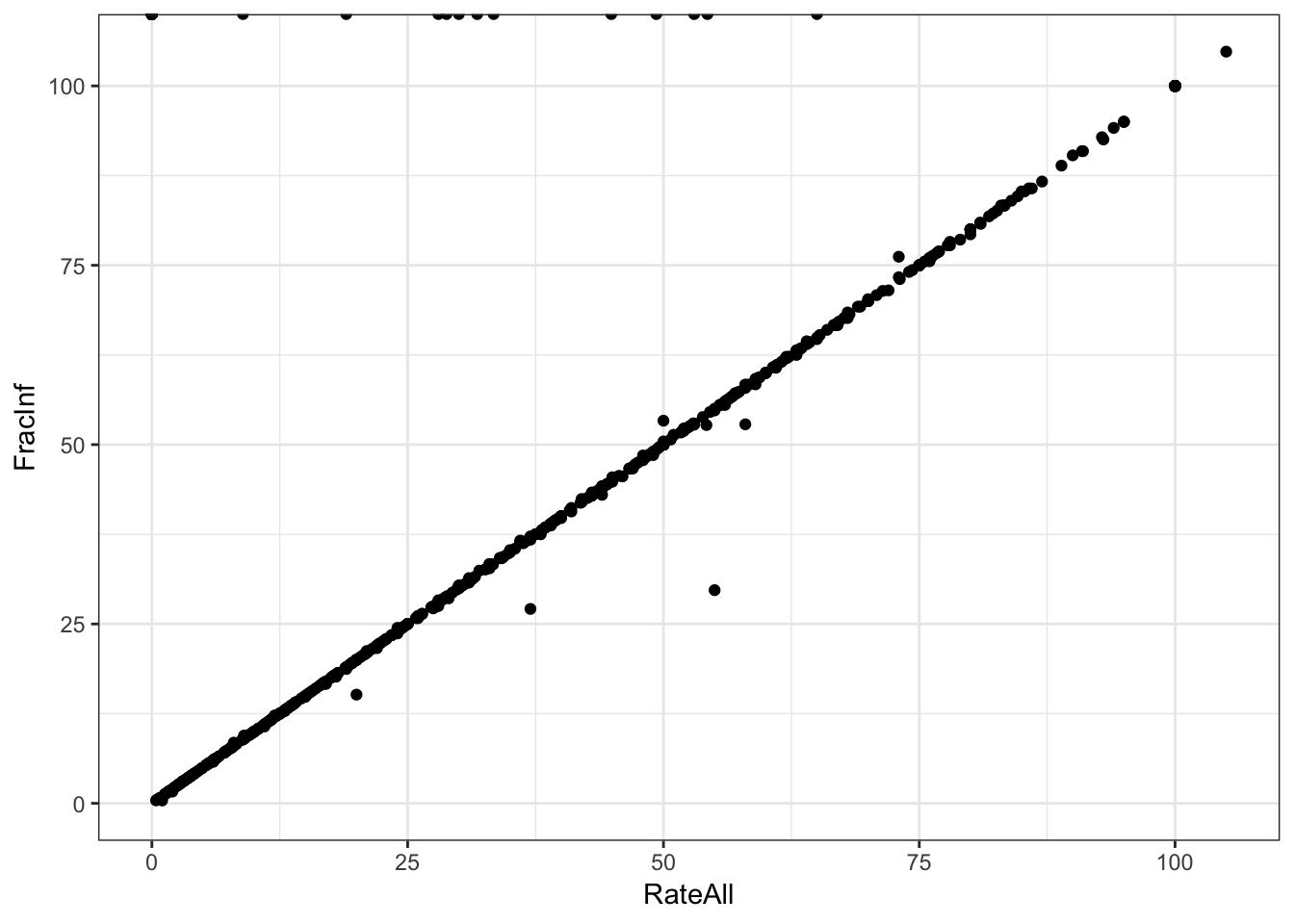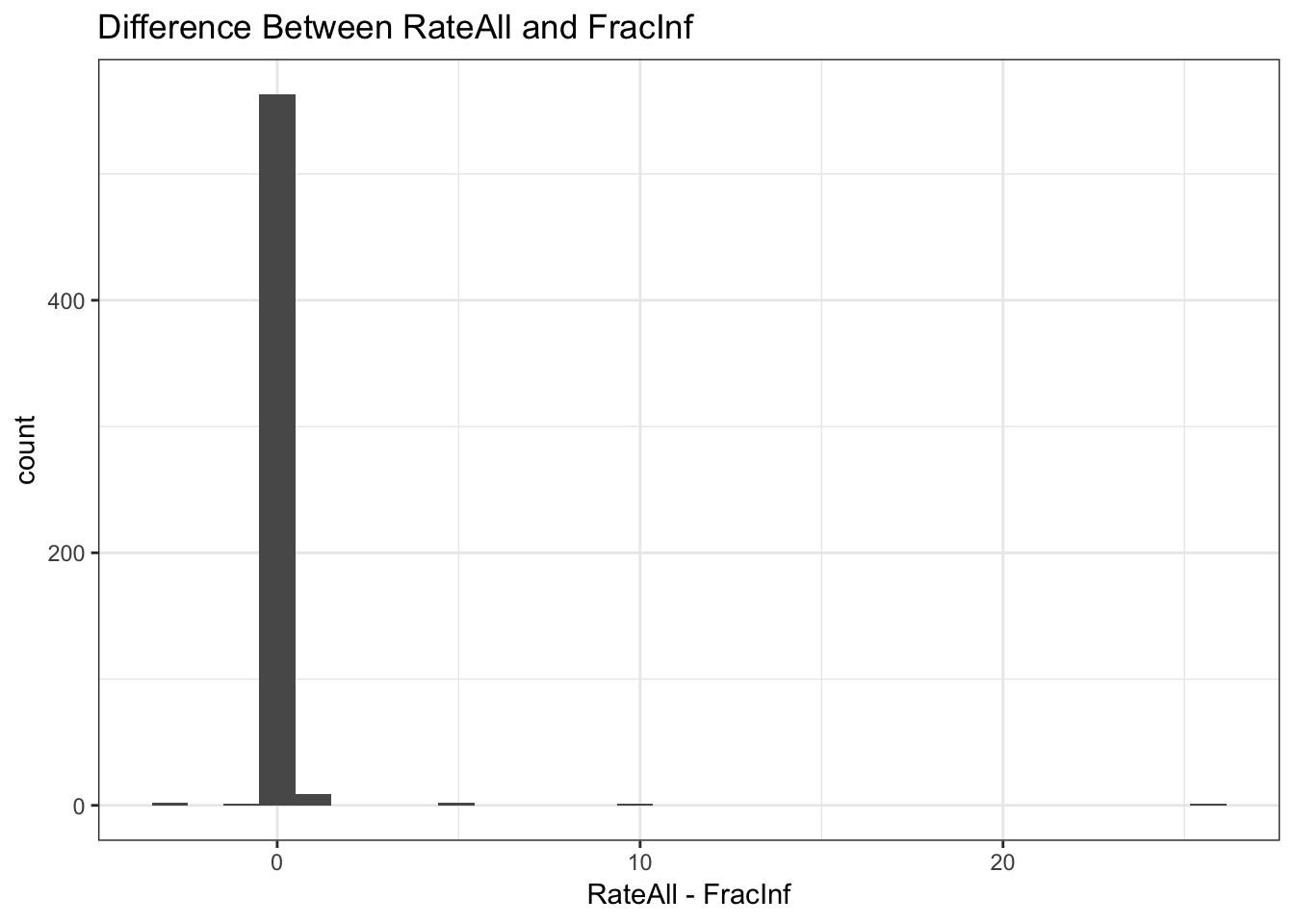 Even if I got the equation correct (which I’m hoping I did), we see some discrepancies between ‘FracInf’ (my calculation) and ‘RateAll’. These seem to stem primarily from records where there were no cases (these should be removed) or there were cases but zero risk (not sure what to do with these).