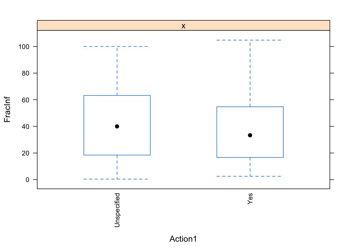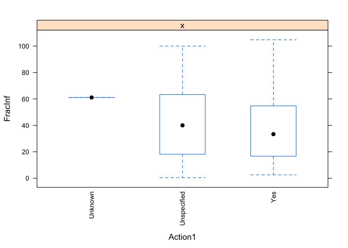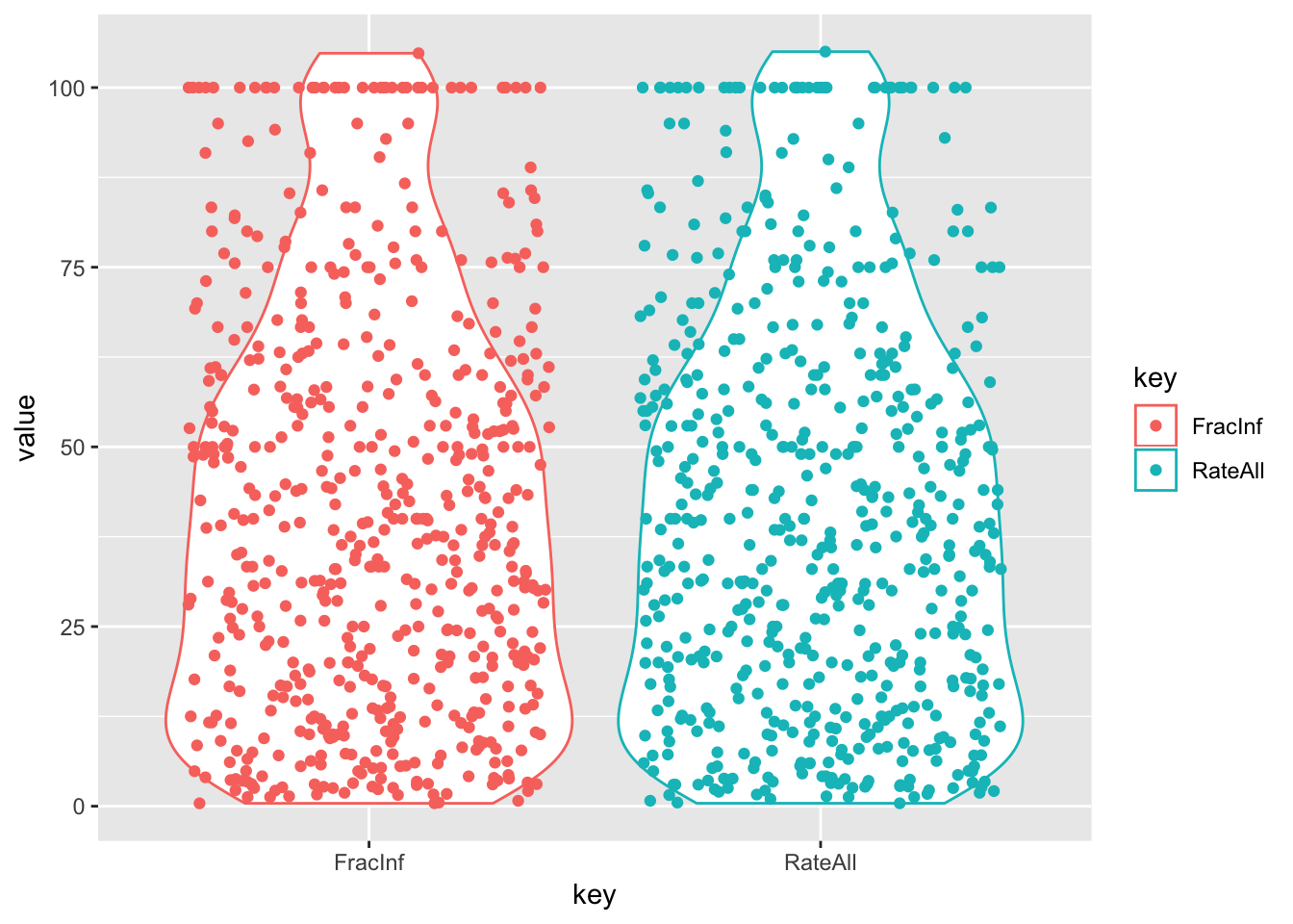 when ‘RateAll’ = NA, ‘FracInf’ = 0 (this occurs when Cases1 = Cases2 = NA. Well that’s weird, not sure why those records are even in there. I SHOULD NOT USE THESE RECORDS)
