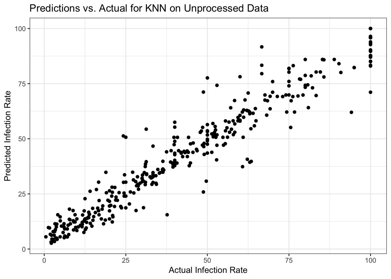 labs(x = "Actual Infection Rate", y = "Predicted Infection Rate", title = "Predictions vs. Actual for KNN on Unprocessed Data") +