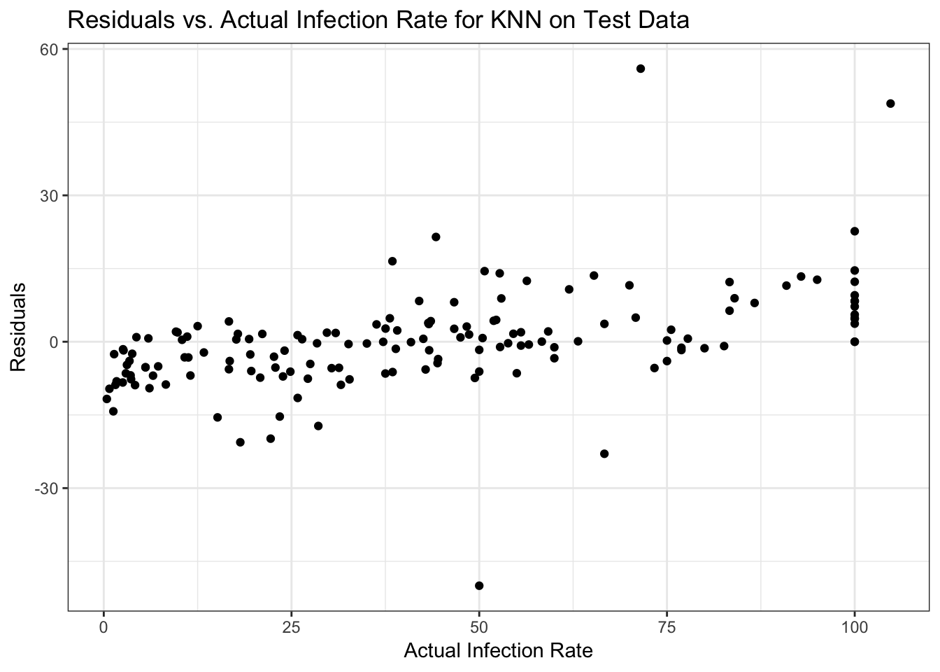 labs(x = "Actual Infection Rate", y = "Residuals", title = "Residuals vs. Actual Infection Rate for KNN on Test Data") +
