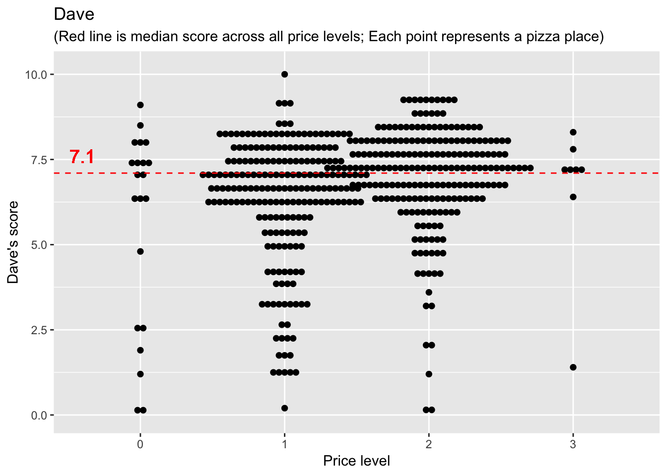 labs(x = "Price level", y = "Dave's score", title = "Dave", subtitle = "(Red line is median score across all price levels; Each point represents a pizza place)")