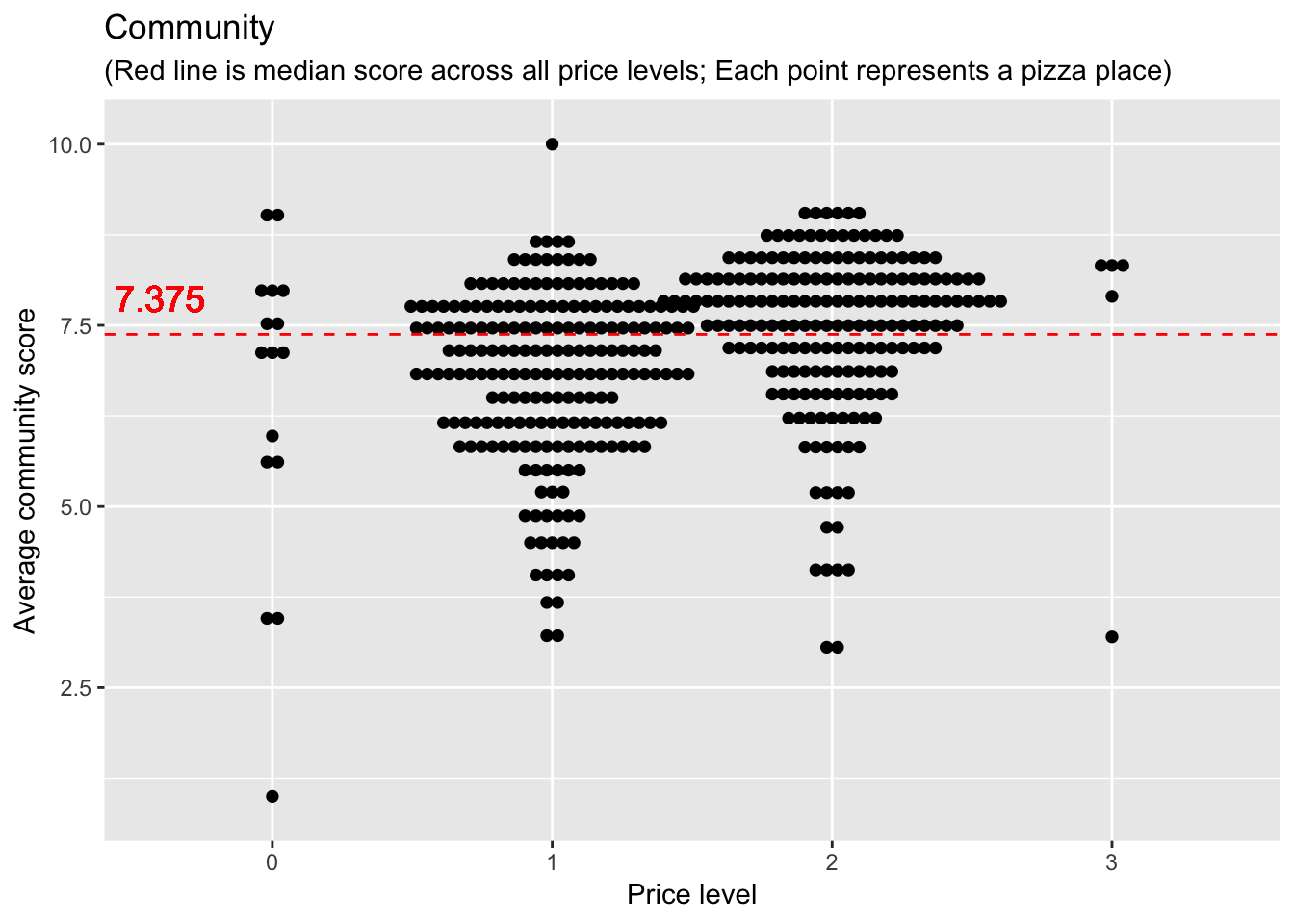 labs(x = "Price level", y = "Average community score", title = "Community", subtitle = "(Red line is median score across all price levels; Each point represents a pizza place)")