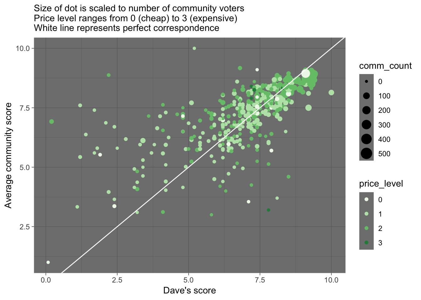 labs(x = "Dave's score", y = "Average community score", subtitle = "Size of dot is scaled to number of community voters \nPrice level ranges from 0 (cheap) to 3 (expensive) \nWhite line represents perfect correspondence")