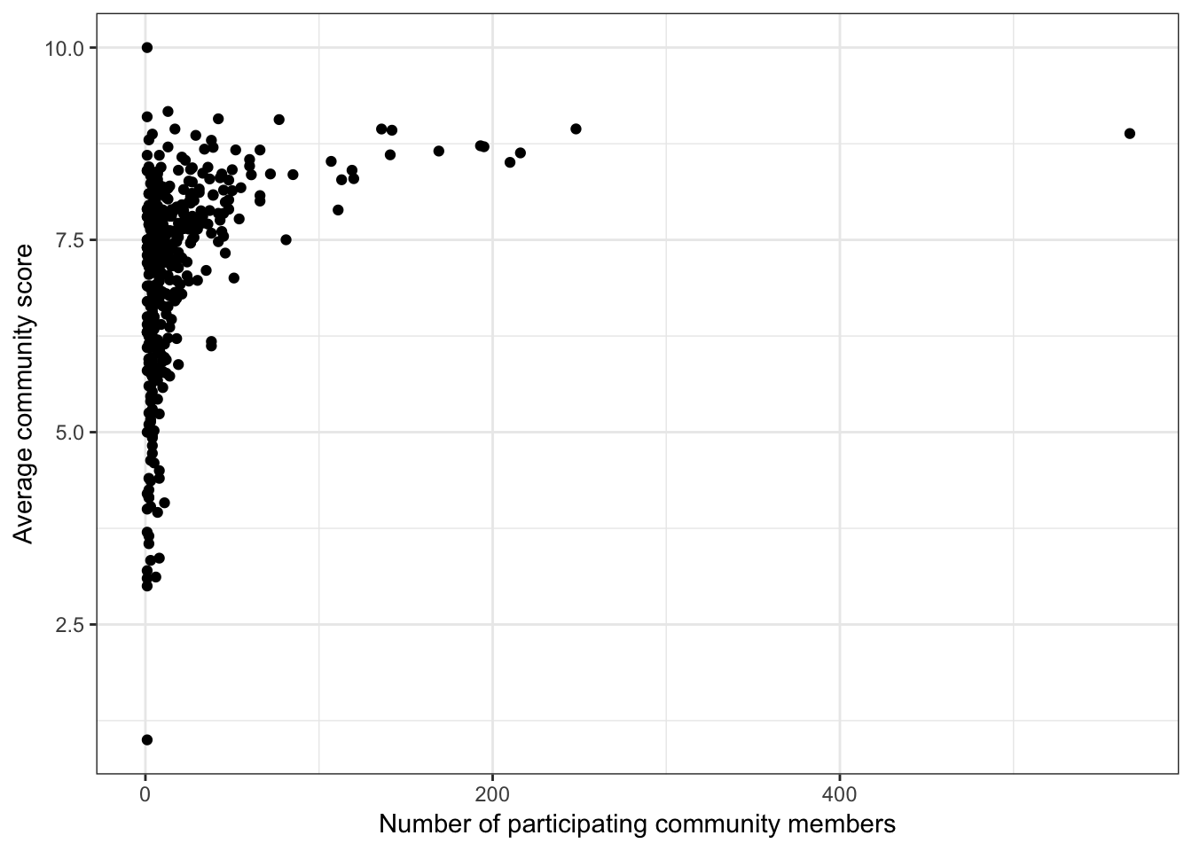 labs(x = "Number of participating community members", y = "Average community score") +