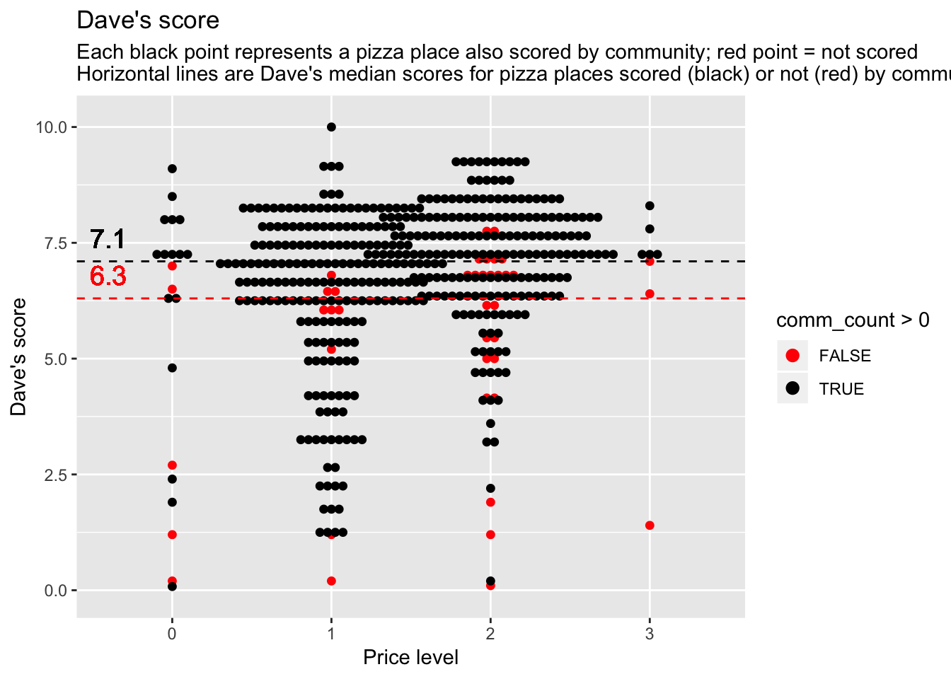 labs(x = "Price level", y = "Dave's score", title = "Dave's score", subtitle = "Each black point represents a pizza place also scored by community; red point = not scored \nHorizontal lines are Dave's median scores for pizza places scored (black) or not (red) by community ")