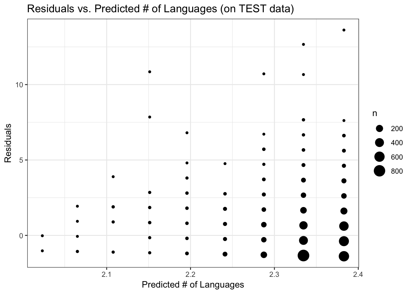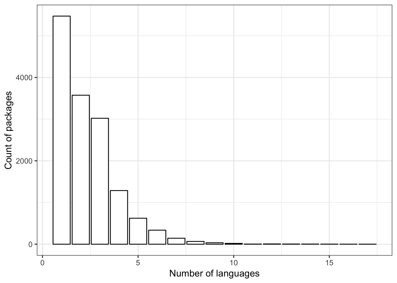 Of the 108 languages, these 37 are represented only once or twice among all the R packages–even more reason to only use a subset of these data, if ‘language’ is going to be part of the analysis: