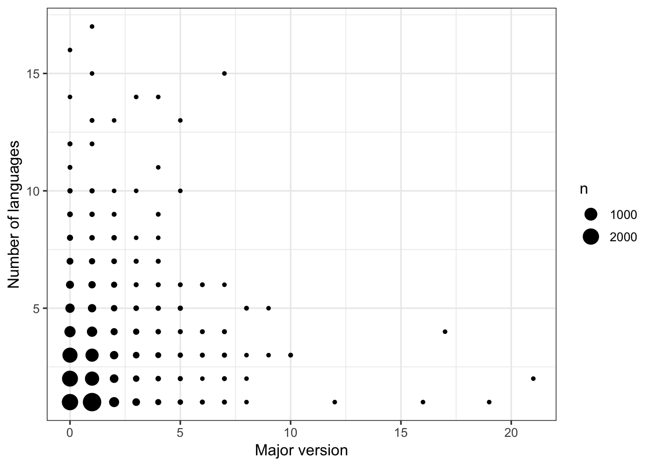 As packages becomes more developed (i.e., major version number is higher), the number of computer languages used in the package may increase because additional languages may be required to perform some more complicated functions efficiently.