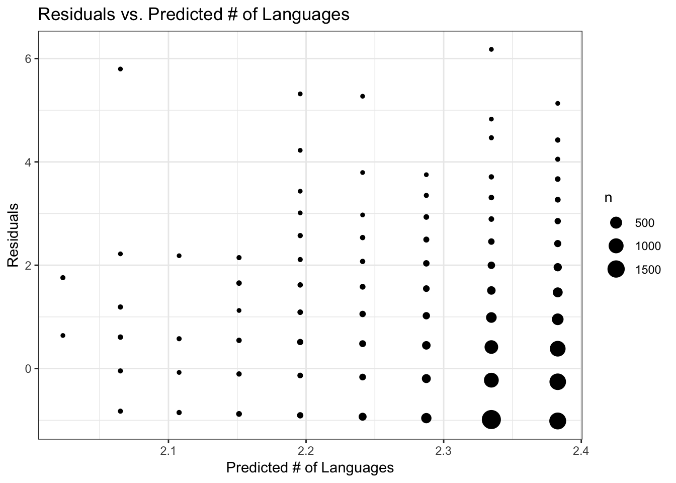 We see that many packages use languages in addition to R. But there are too many languages here to work with as a categorical response or predictor (N = 108)! Luckily, there are just a few languages that make up the bulk of the data records. Which are the most common? Here are the top 10 languages (count = # of data records):