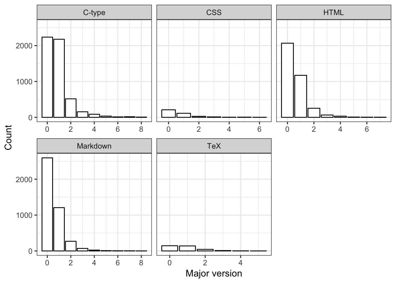 dplyr::mutate(maj_version = as.numeric(gsub("\\..*$", "", version))) # forcing it to be numeric gets rid of some of the funny date versions