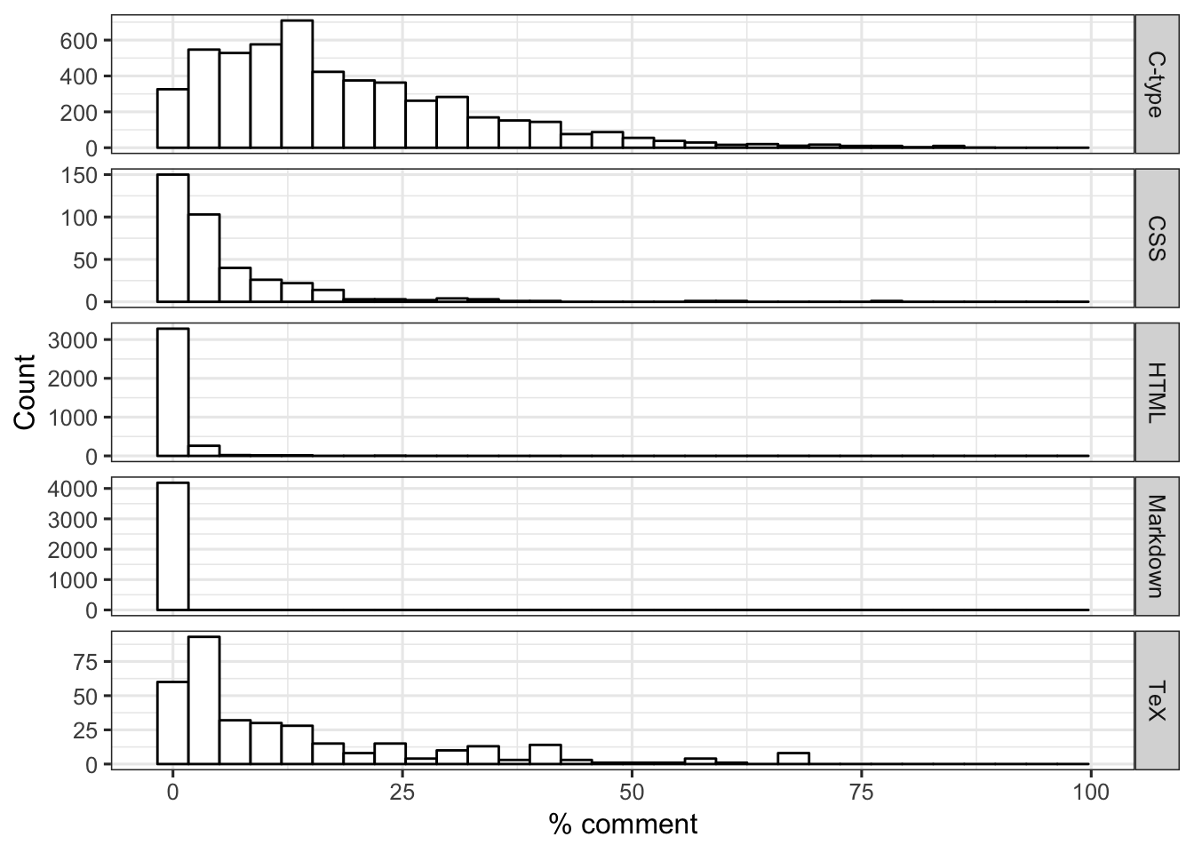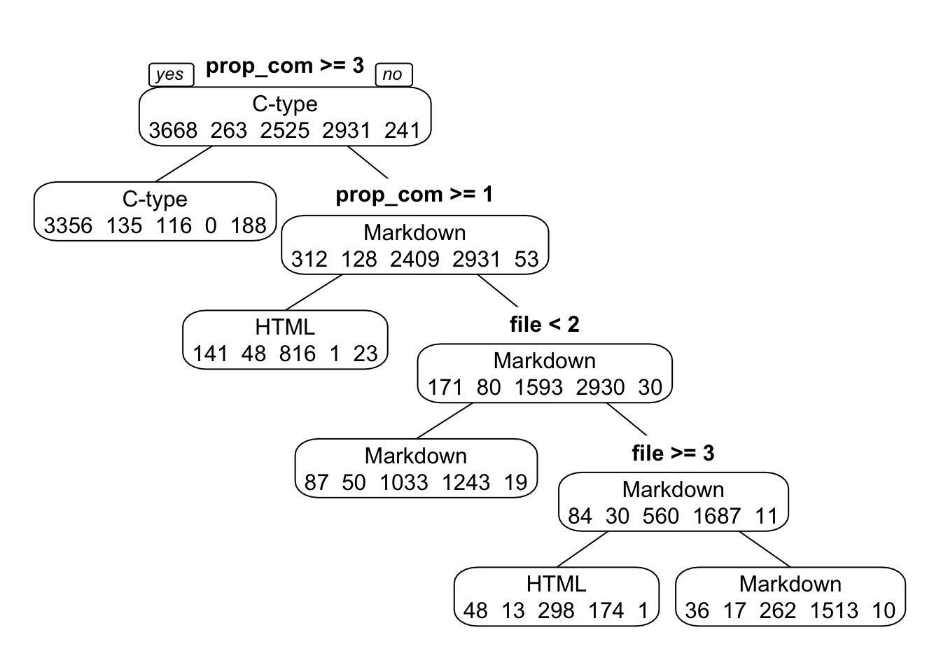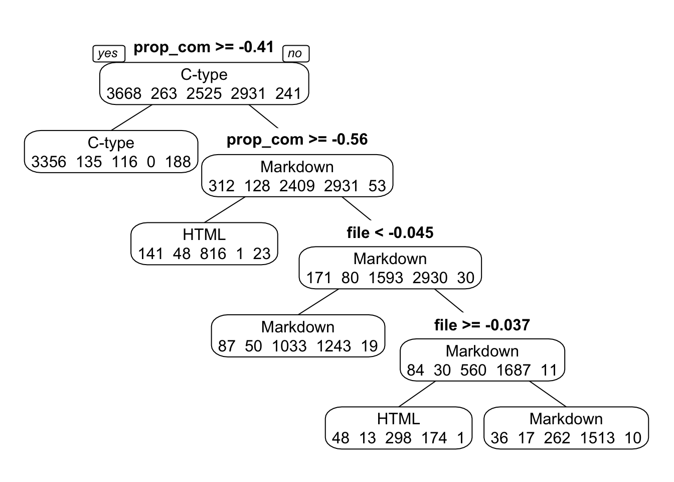 MY CONCLUSION FROM THIS ANALYSIS is that a relatively small number of prediction splits can classify languages with not-too-bad accuracy (75% accuracy) compared to the null model (38% accuracy). The most important predictors are % comments (with splits at 1% and 3% comments) and, secondarily, the number of files (with a split at 3 files). The model is pretty good at correctly classifying C-type language and not too bad with Markdown. Its performance with classifying HTML is meh. The other two languages were pretty infrequent in the data, so it’s not too surprising that the model isn’t great at classifying them (CSS and TeX).