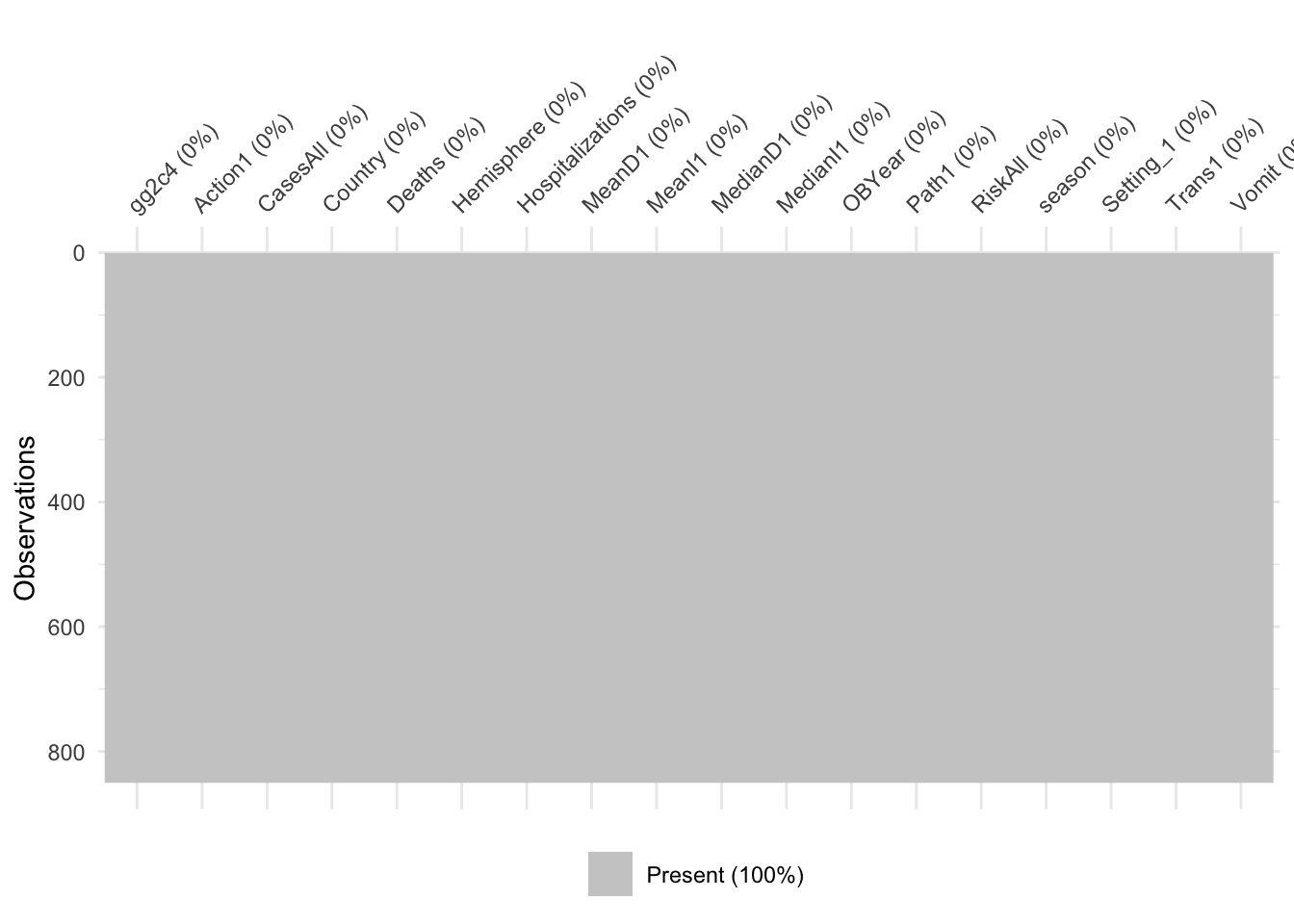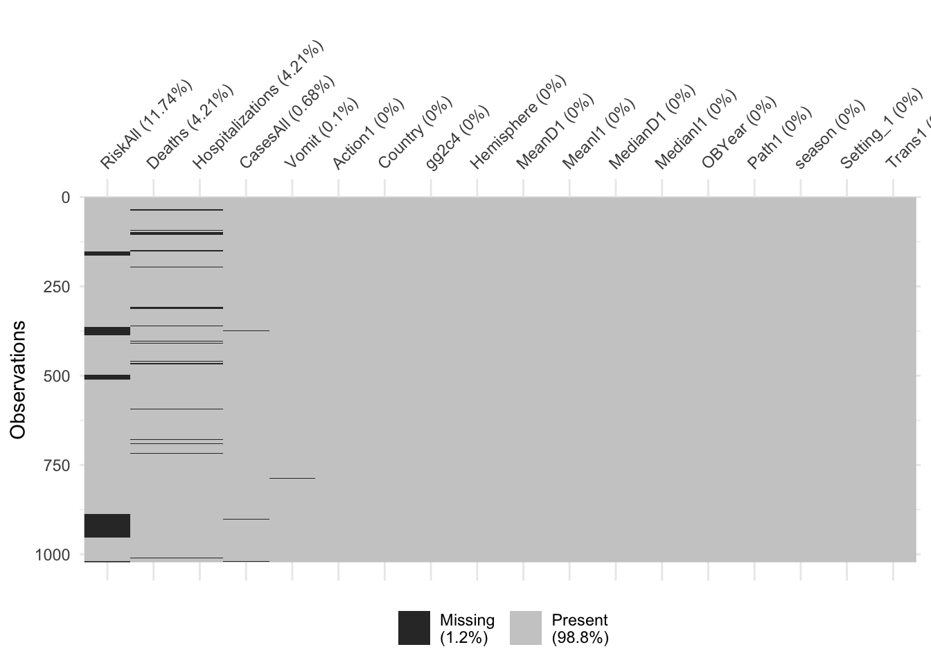 d <- data_raw %>% dplyr::select(Action1, CasesAll, Country, Deaths, gg2c4, Hemisphere, Hospitalizations, MeanD1, MeanI1, MedianD1, MedianI1, OBYear, Path1, RiskAll, season, Setting_1, Trans1, Vomit)
