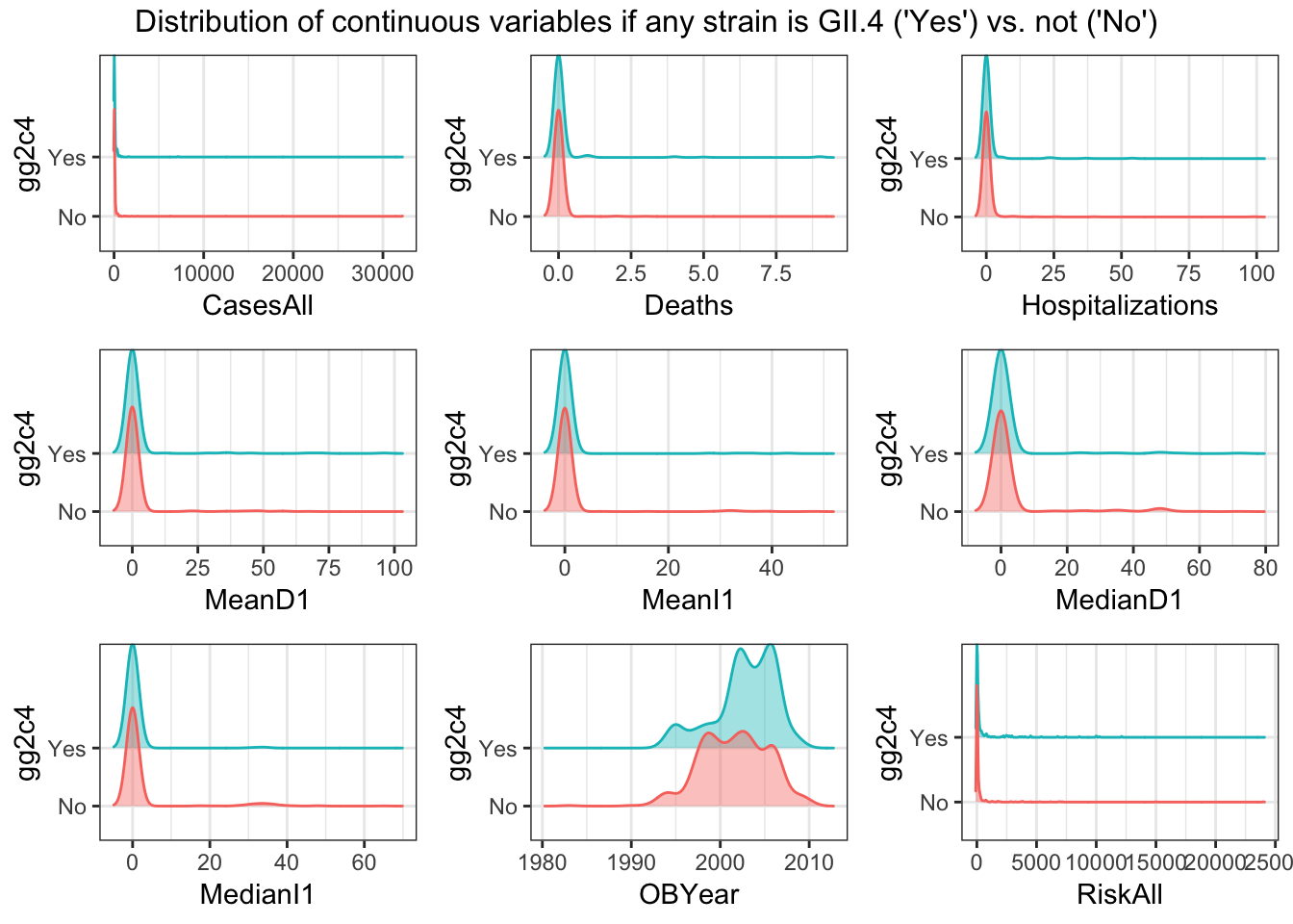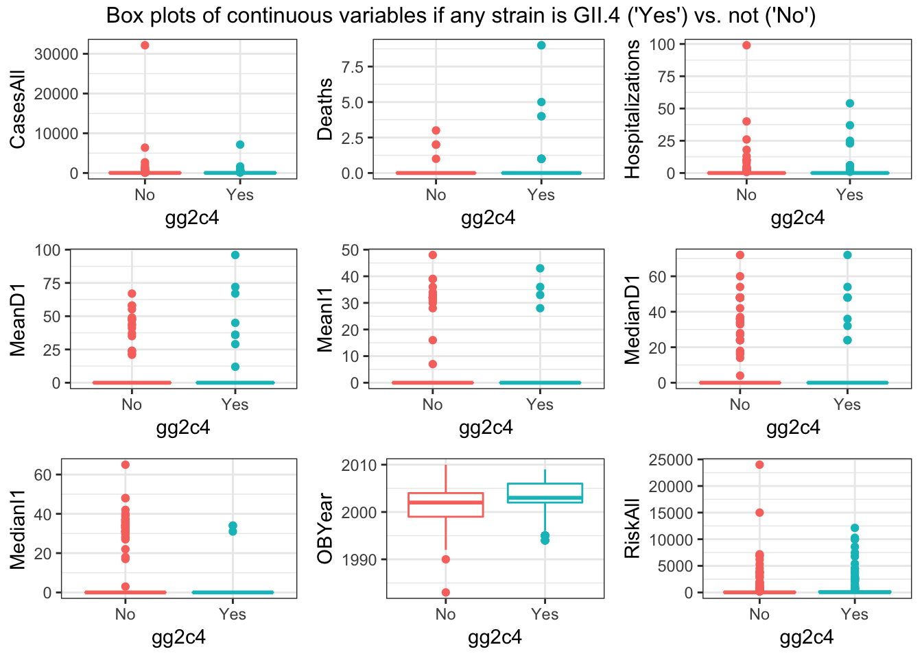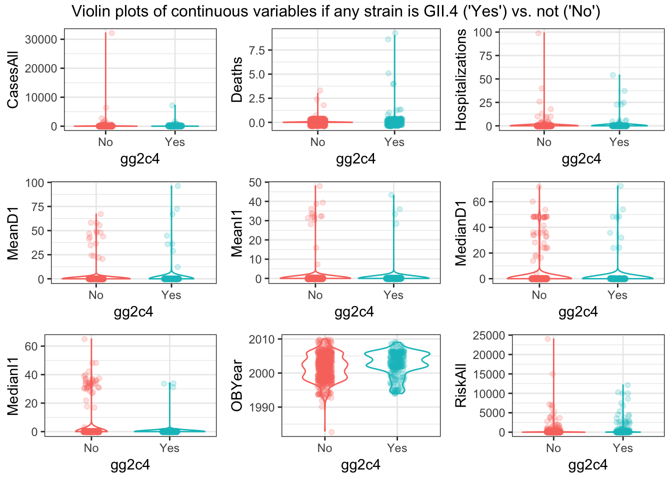 For this analysis, our main outcome of interest is if an outbreak was caused by the G2.4 strain of norovirus or not, and how other factors might be correlated with that strain.