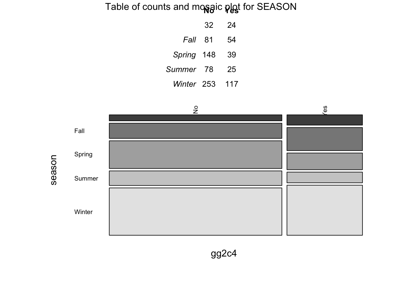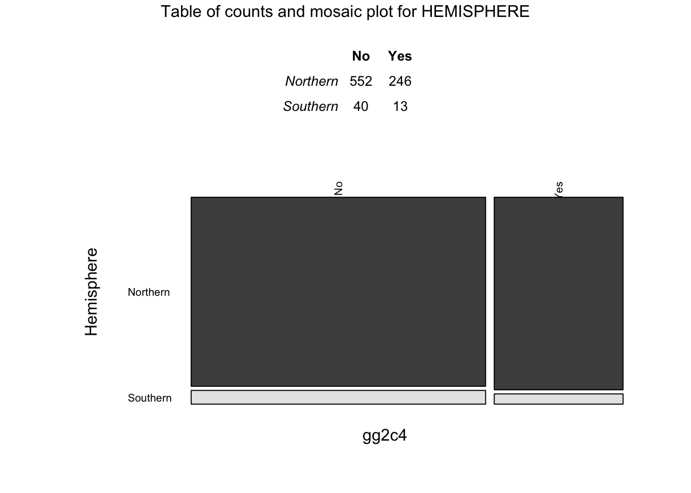 Overall, it looks ok, a decent amount in each category (i.e. no unbalanced data). However, we see an odd coding, there are only 2 types of entries, either “Yes” or "“, i.e. an empty space. The codebook tells us that this is how things were coded, if it was G2.4 it got a”Yes“, if it wasn’t it did get an empty space instead of a”No“. That’s somewhat strange and while the analysis should work, it is better to re-code the empty slots with”No".